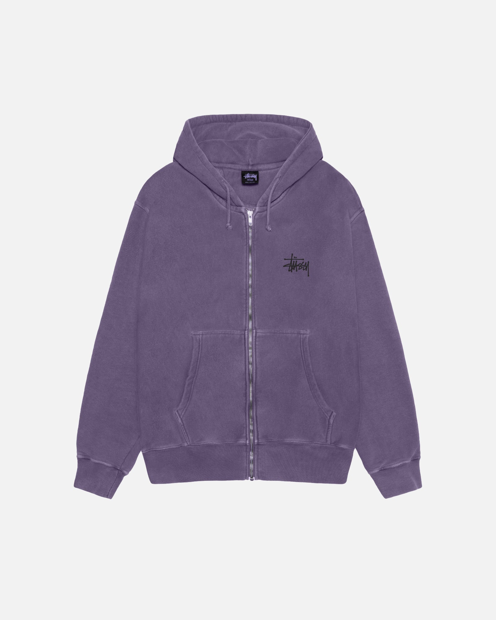 Relaxed fit zip-front fleece hoodie in a heavyweight pigment dyed 450gsm cotton blend. Stüssy basic logo at left chest and across back. Screenprinted using water-based ink for a soft hand feel. - Longsleeve - Round woven drawcord - #5 YKK zip front closure - Ribbed cuffs and hem - Kangaroo pocket - Relaxed fit - Unisex - Material: 100% cotton - Imported *This garment has been individually dyed, producing a one-of-a-kind result. Color may fade or bleed after wash.