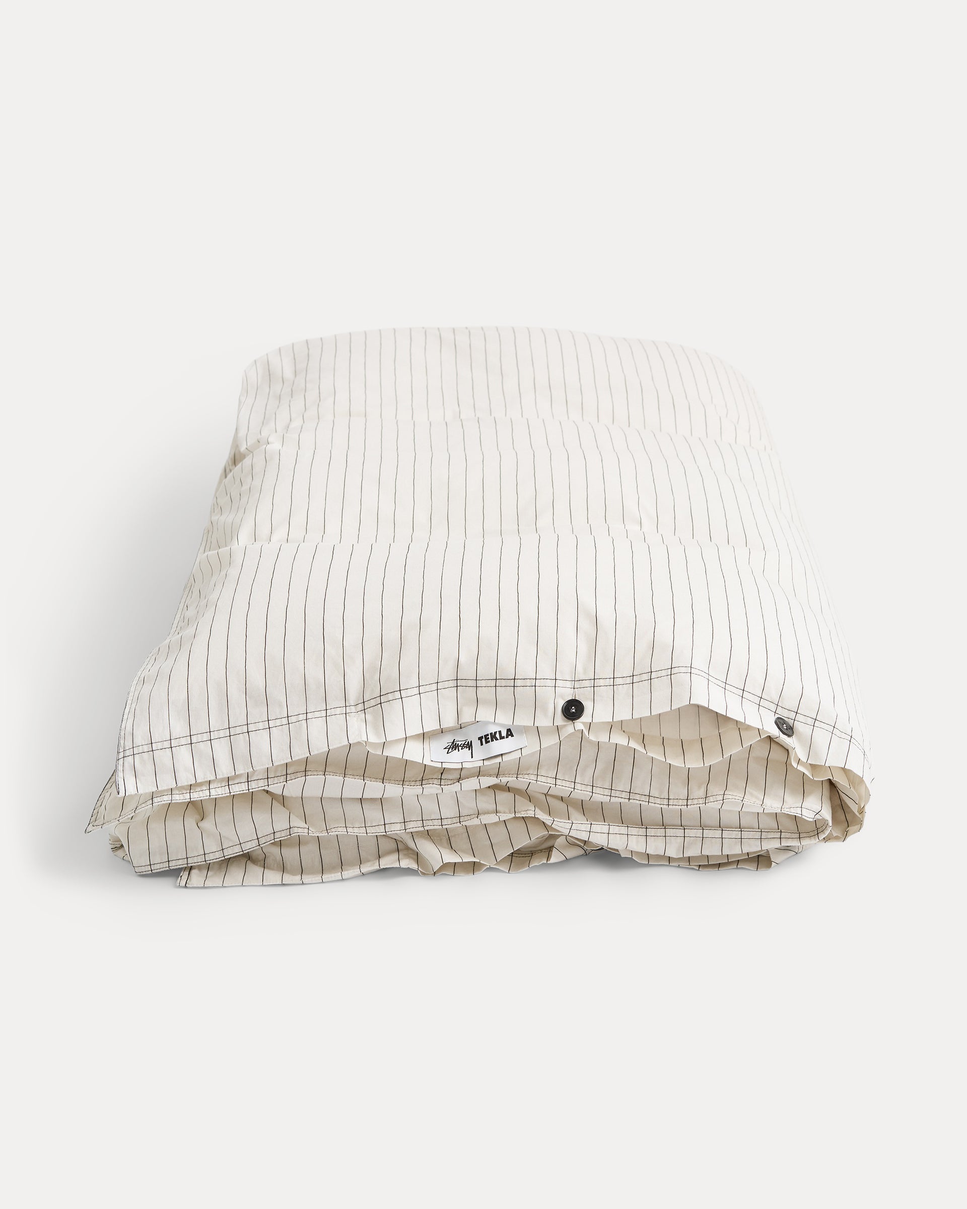 Duvet cover in lightly stonewashed organic percale cotton. Woven using extra long yarn that softens over time without pilling. Stüssy & Tekla co-branded label. - Queen: 230cm x 235cm - King: 270cm x 235cm - 200 thread count - Button closure - Corner ties - Material: 100% organic cotton - Made in Portugal