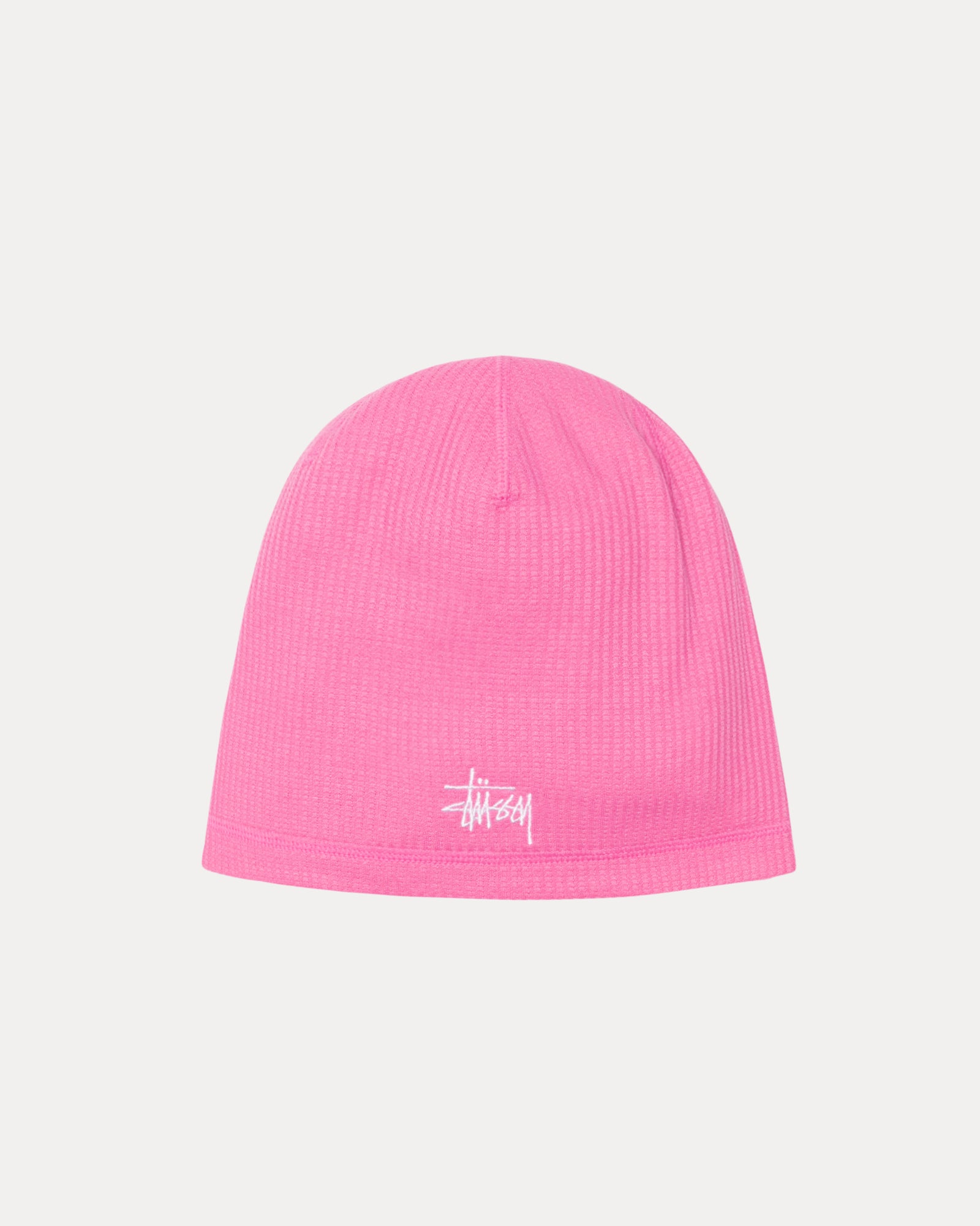 Fitted skullcap beanie with a waffle texture. Stüssy basic stock logo embroidery at the front. - 6-point top construction - Tonal coverstitched seams - Classic fit - One size - Unisex - Material: 95% polyester / 5% spandex - Imported